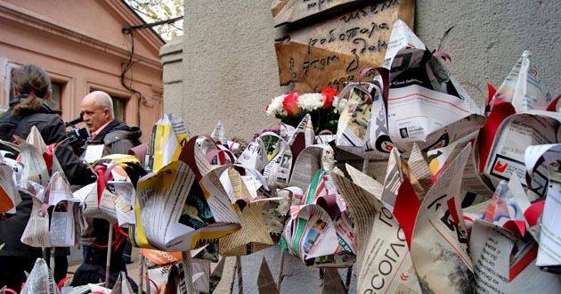 Возложение бумажных цветов к мемориалу Анны Политковской. Москва, 7 октября 2014 г. Фоторепортаж корреспондента "Кавказского узла" Аиды Магомедовой