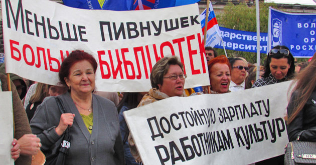 Волгоградский областной совет профсоюзов провел 7 октября митинг под девизом «За справедливую бюджетную политику! Нет произволу финансистов!». Основное требование – прекращение «оптимизации» учреждений культуры. Выступающие на митинге выразили недоверие финансовой политике правительства России, направленной «на осознанное сокращение социальных обязательств государства». Особое возмущение активисты выразили по поводу предложений министерства финансов повысить пенсионный возраст, снизить уровень страхового обеспечения, возложить на работников обязанность по уплате дополнительных страховых взносов. Но большая часть выступлений ораторов была посвящена проблеме так называемой оптимизации культурной сферы.