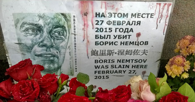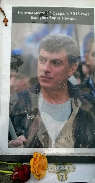 Десятки портретов и фотографий Бориса Немцова стоят у бордюра или лежат на тротуаре моста