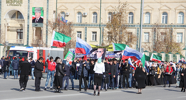 В праздничном мероприятии в Грозном приняли участие работники бюджетной сферы и студенты со всех концов республики. Праздничный концерт, организованный властями Грозного, проходил на площади перед мечетью Сердце Чечни. Концертную программу представили артисты местной эстрады, чиновники выступили с различными докладами. Студентов заранее предупредили об обязательной явке на праздничное мероприятие