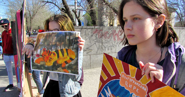 Активисты держали в руках плакаты «Любишь цирк? А жить в клетке!», «Цирк – тюрьма», «Помогите нам, не ходите в цирк», «Цирк – это жестоко. Животные – не клоуны», «Вам весело, а им больно»