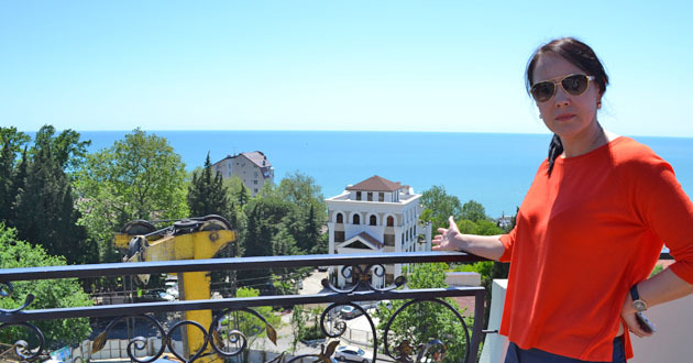 Хозяйка 4-х звездочного отеля Оксана Потапова показывает на развернувшуюся стройку под балконами ее гостиницы