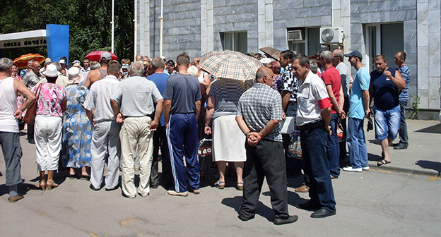 27 июня в городе Гуково прошел многолюдный пикет местных жителей, бывших работников шахтерских предприятий, которые требовали выплаты задолженности по зарплате. Несмотря на 35-градусную жару, возле офиса компании “Кингкоул “Юг” собралось около 200 человек.