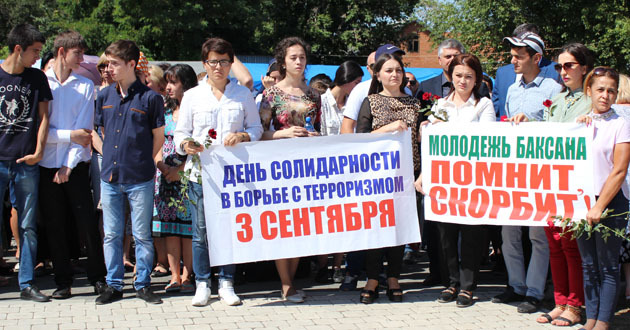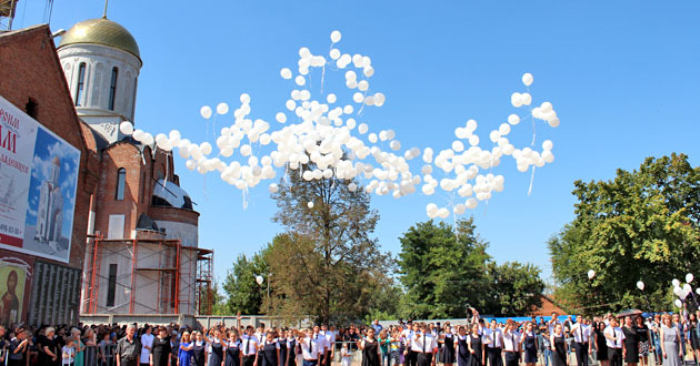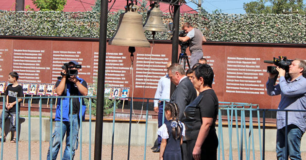В 13:05 – время начала трагической развязки – мужской голос прочитал стихотворение Ш. Джигкаева на осетинском языке, посвященное погибшим. После двух ударов колокола была объявлена минута молчания. После этого школьники выпустили в небо 334 белых шара по числу жертв теракта.