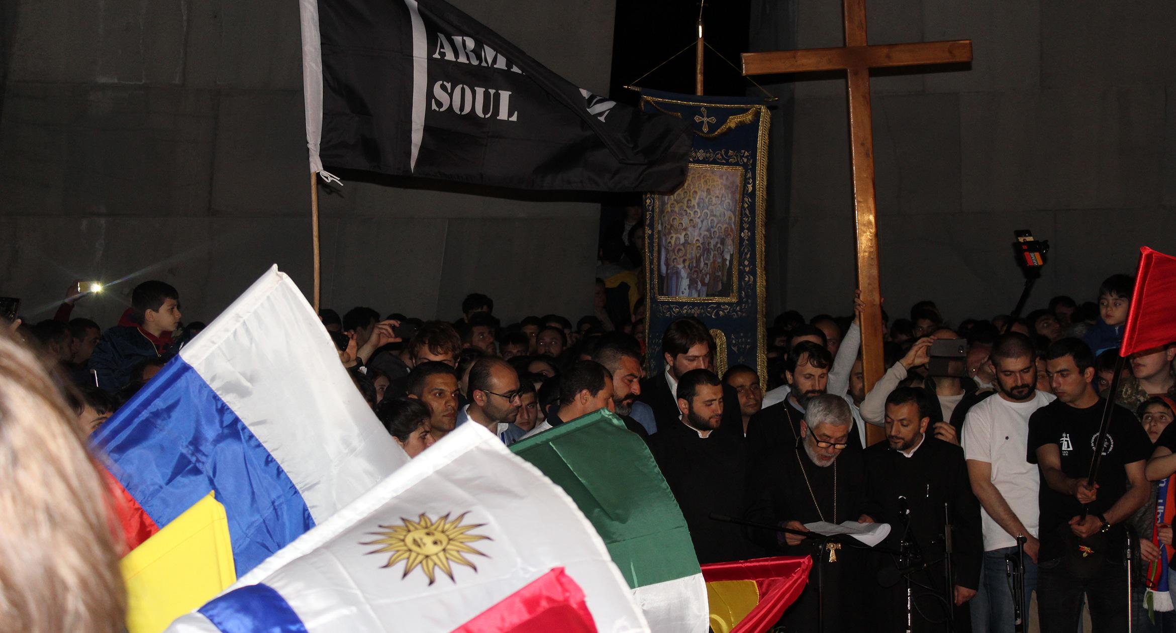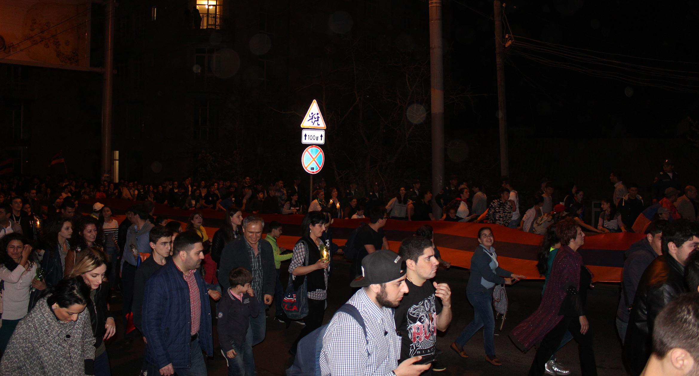 Факелы и лампады в руках участников шествия памяти геноцида армян в Ереване. 23.04.2017