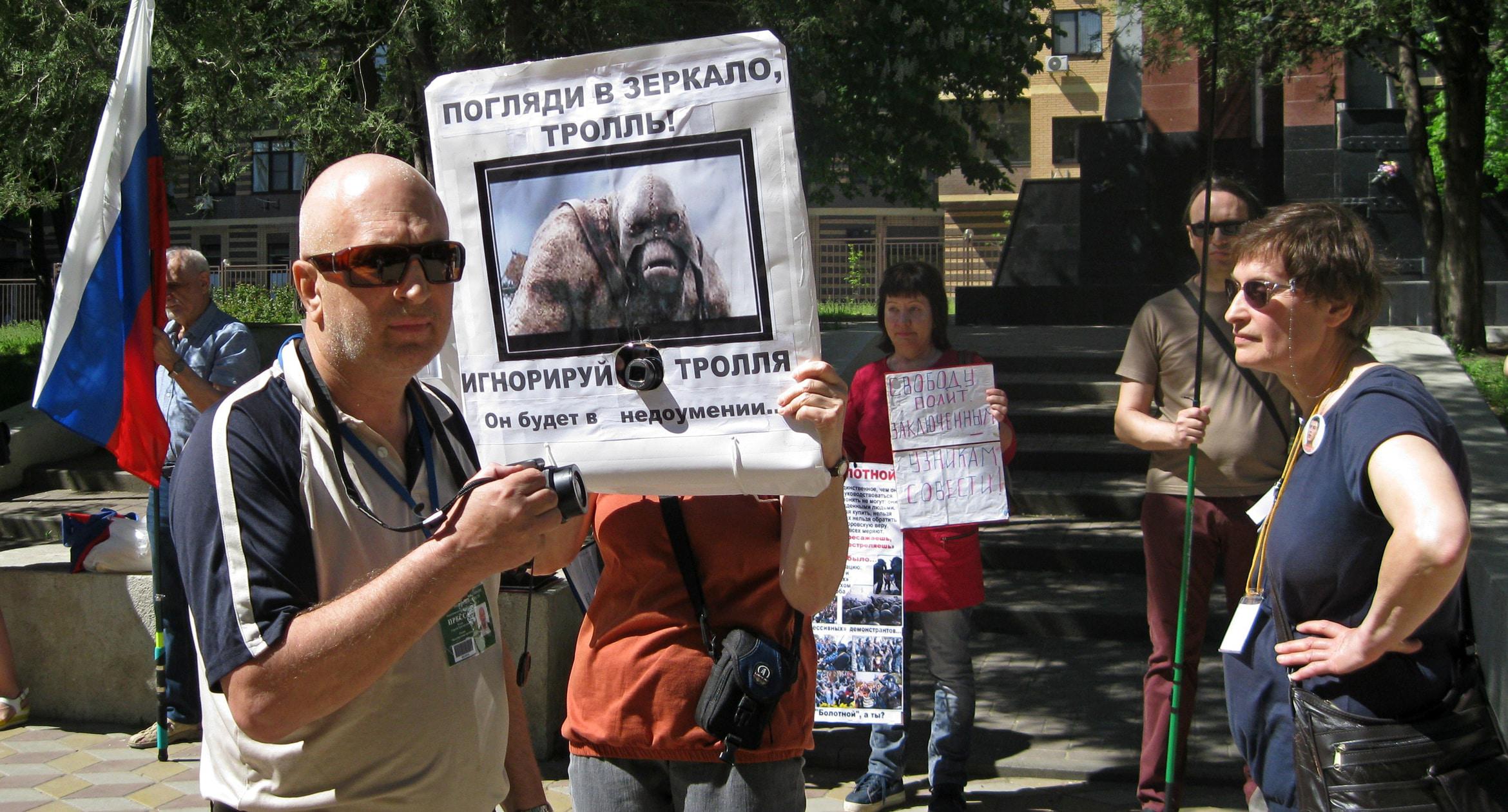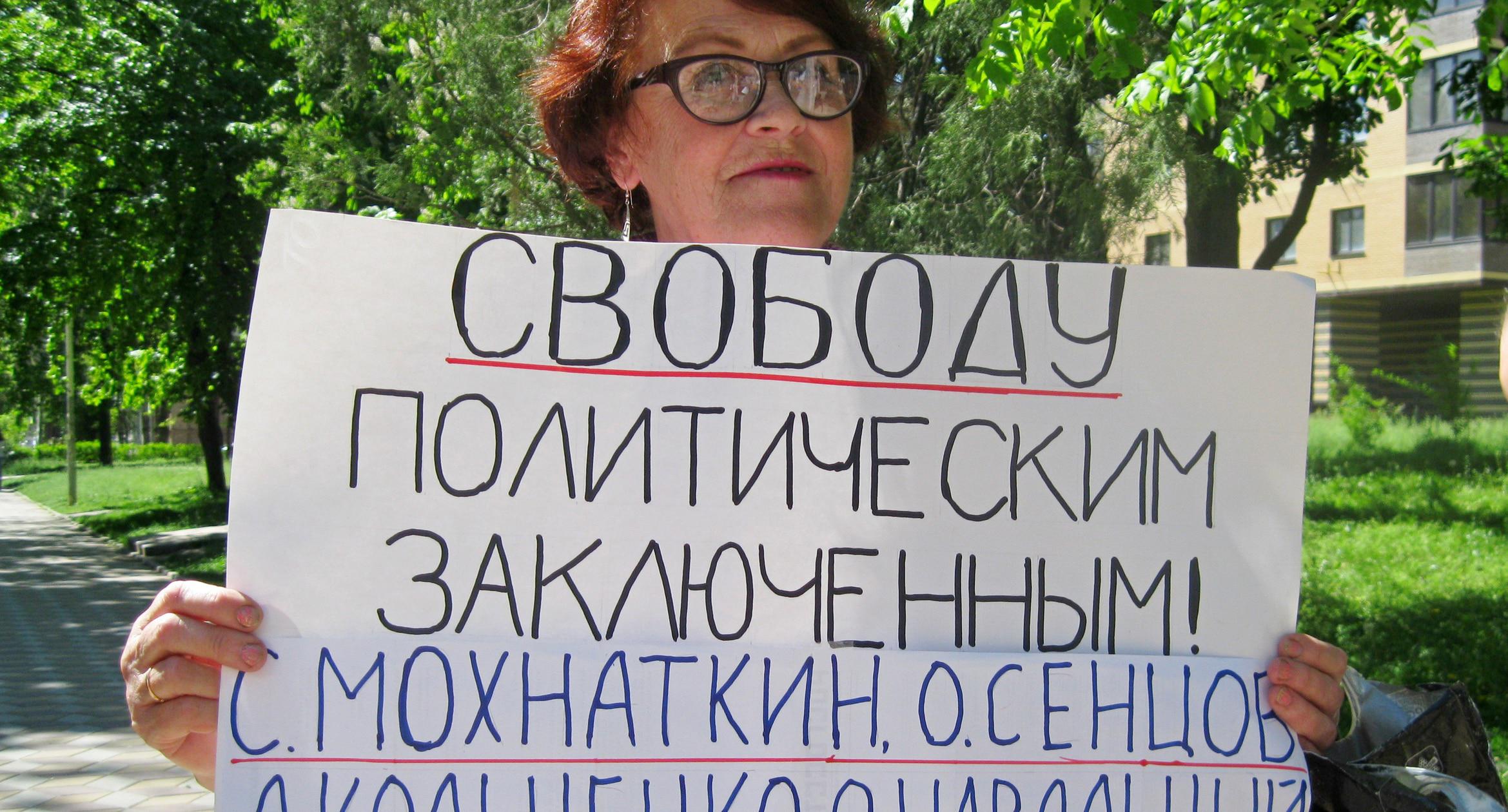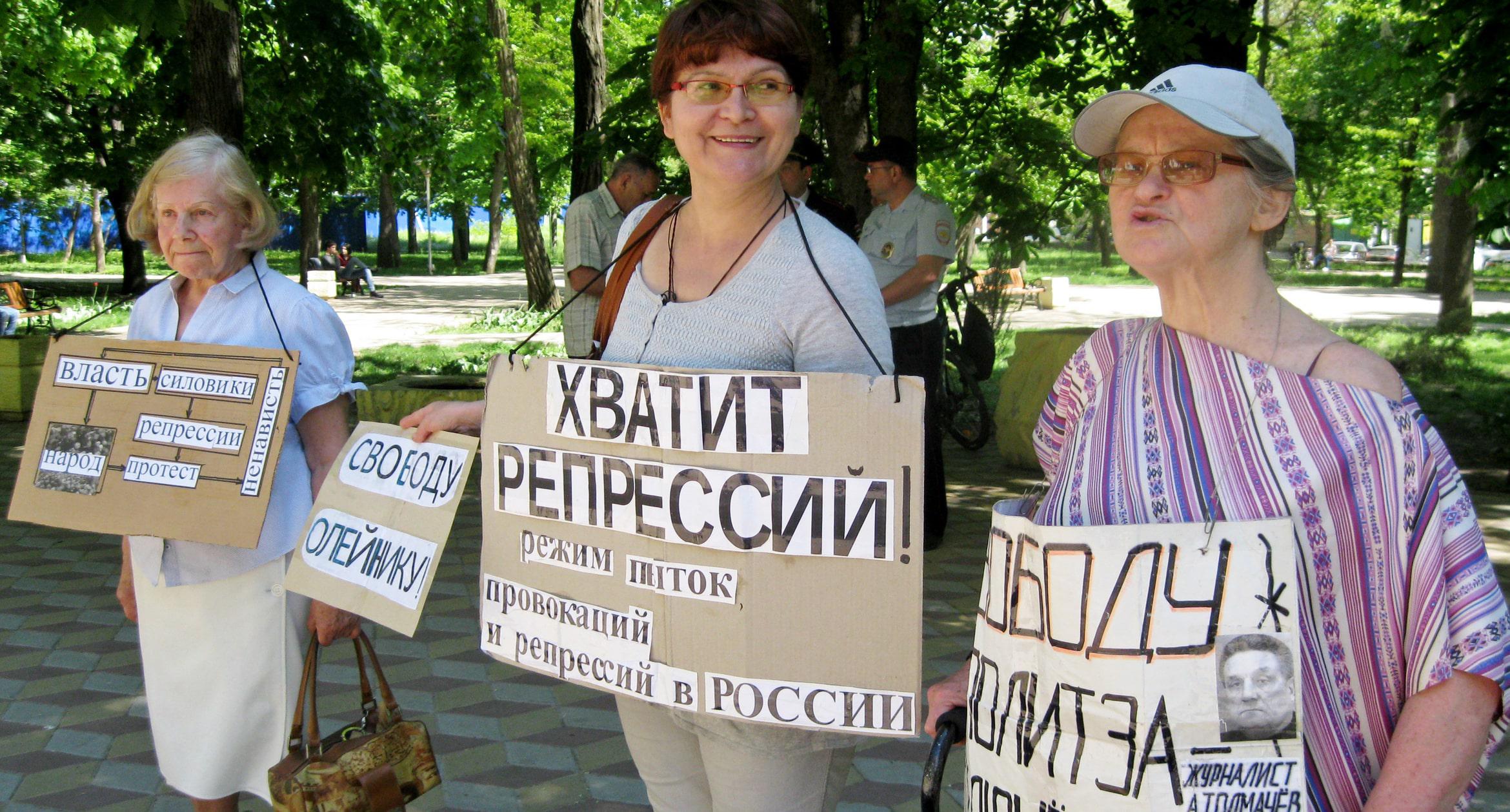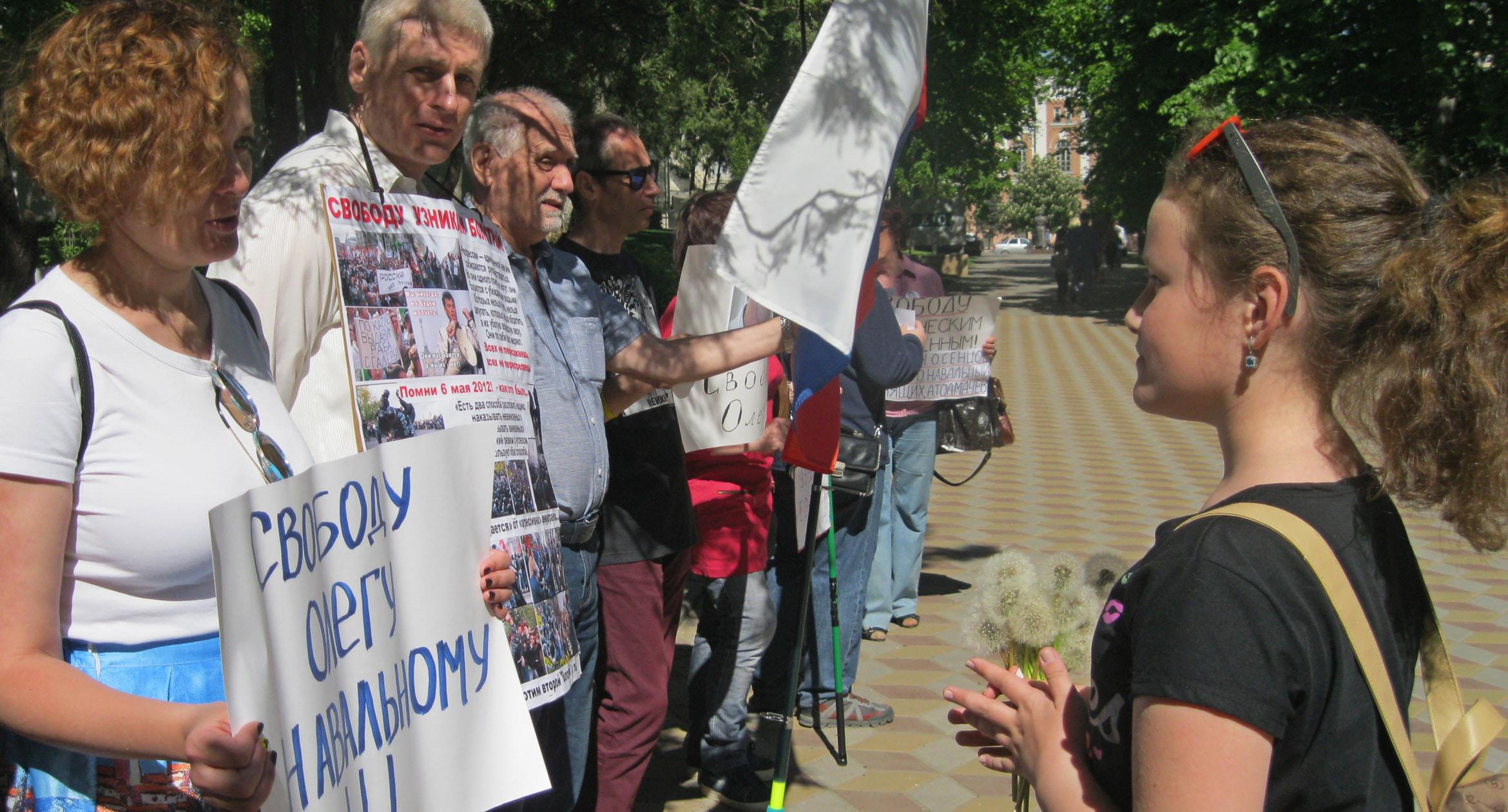 Около тридцати жителей Ростова-на-Дону 6 мая 2017 года вышли на акцию, посвященную пятилетней годовщине событий 6 мая на Болотной площади, когда разрешенная властями акция оппозиции переросла в столкновения с полицией. Охрану общественного порядка и безопасности обеспечивали полтора десятка сотрудников полиции. Мероприятие состоялось в городском парке Строителей около мемориала жертвам политических репрессий. Участники пикета вышли на митинг с российскими флагами и флагами партии «Гражданская инициатива», также в руках у них были фотографии политзаключённых, в частности Дарьи Полюдовой, Олега Навального, ростовского журналиста Александра Толмачёва. Единственным инцидентом стало задержание известного блогера и репортёра Сергея Рулёва, который обозвал и толкнул одну из участниц. Собравшиеся потребовали освободить всех политических заключённых, а также прекращения «Болотного дела». Организаторы сообщили корреспонденту “Кавказского узла”, что изначально они планировали провести акцию на площади перед парком имени Горького, однако её перенесли в безлюдный парк Строителей. Фото Константина Волгина для “Кавказского узла”