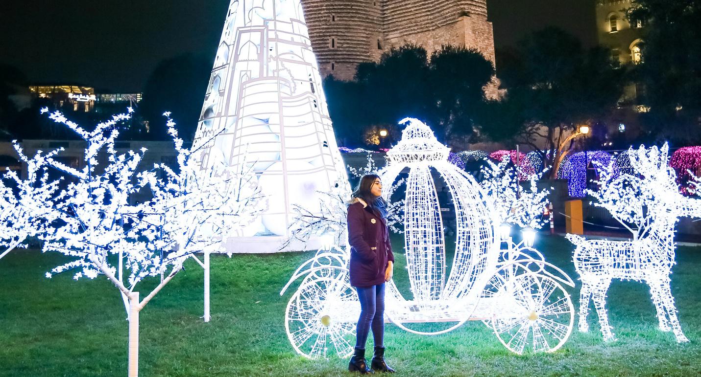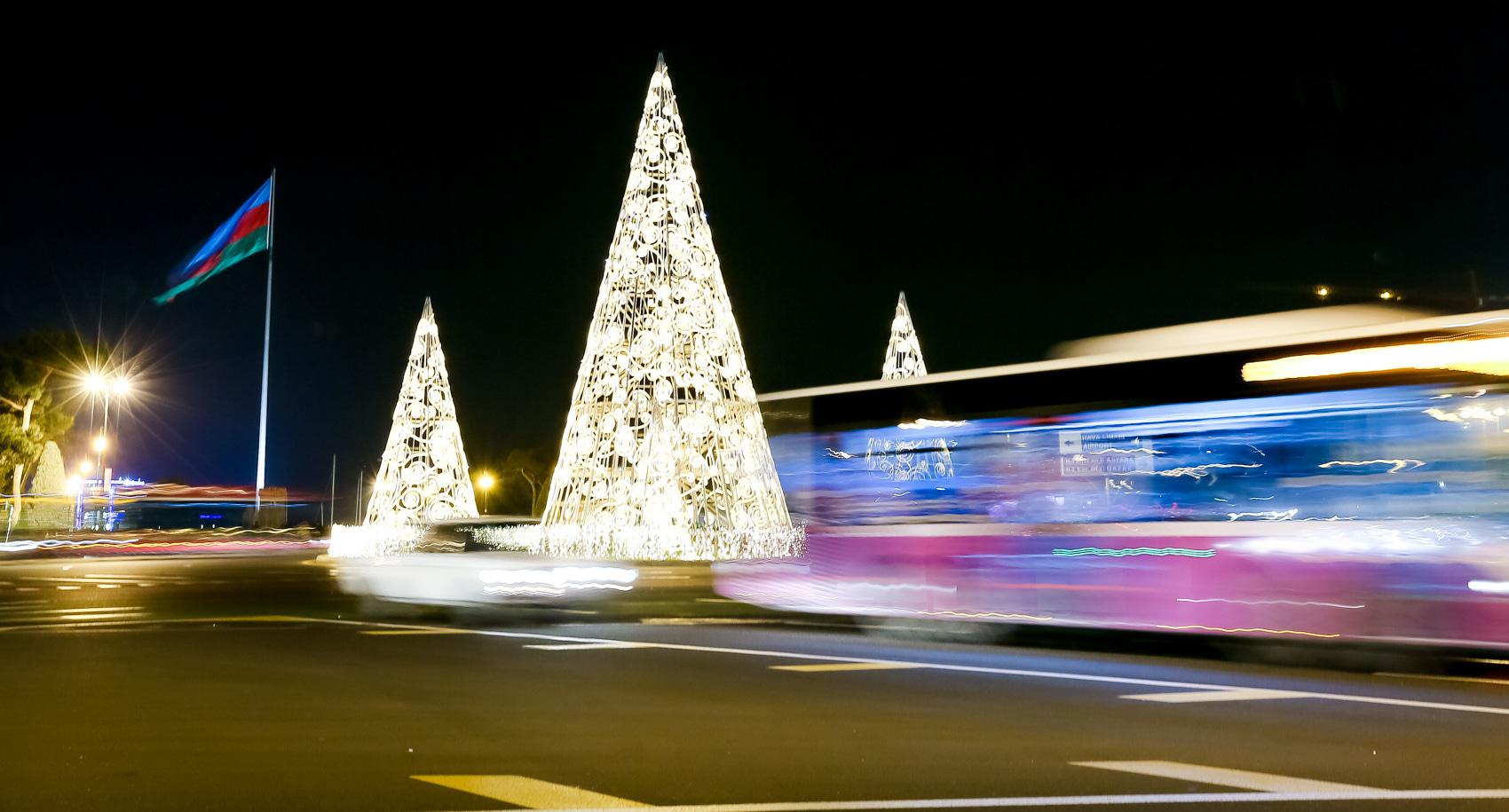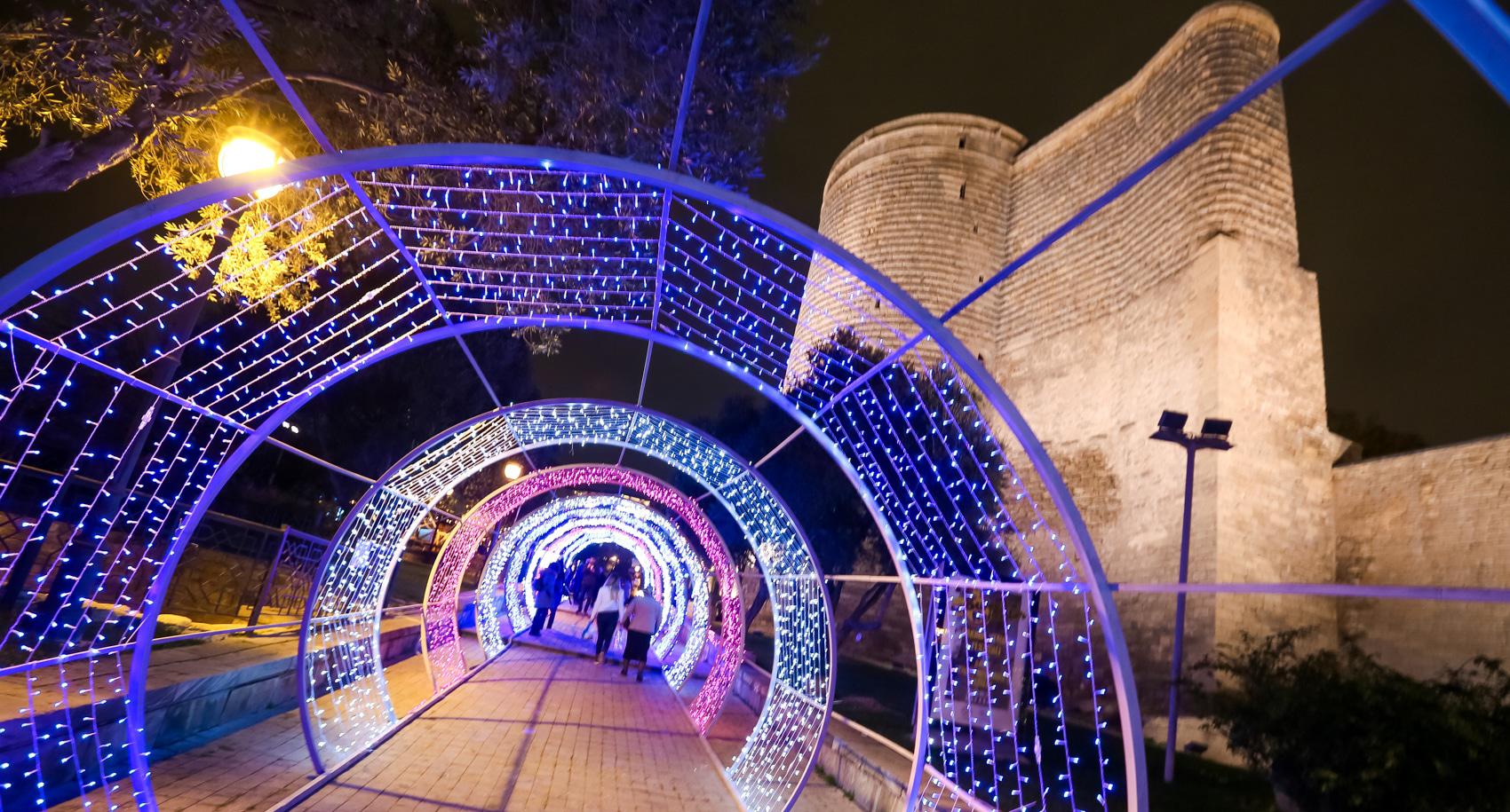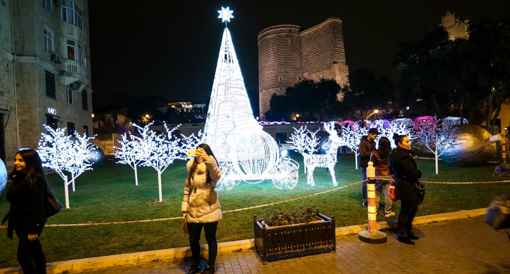 Перед Новым годом Баку особенно красив. В вечерние часы город сверкает иллюминацией. Световыми гирляндами украшены стены Старого города. На Площади фонтанов – новогодняя ярмарка, где можно купить книги и сувениры. Здесь же горожане и туристы могут перекусить в импровизированных кафе. Высокие праздничные елки установлены на Площади Фонтанов, Площади Азнефть и Зимнем парке. Для забавы детворы установлены аттракционы. Близ Девичьей башни можно пройти по «световому тоннелю». Фоторепортаж корреспондента “Кавказского узла” Азиза Каримова.