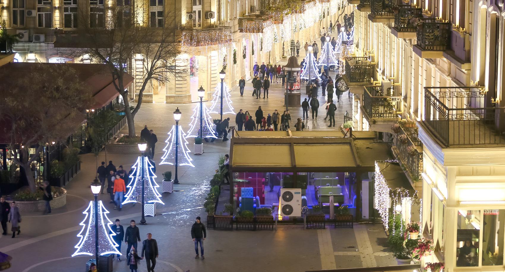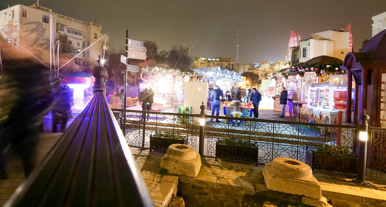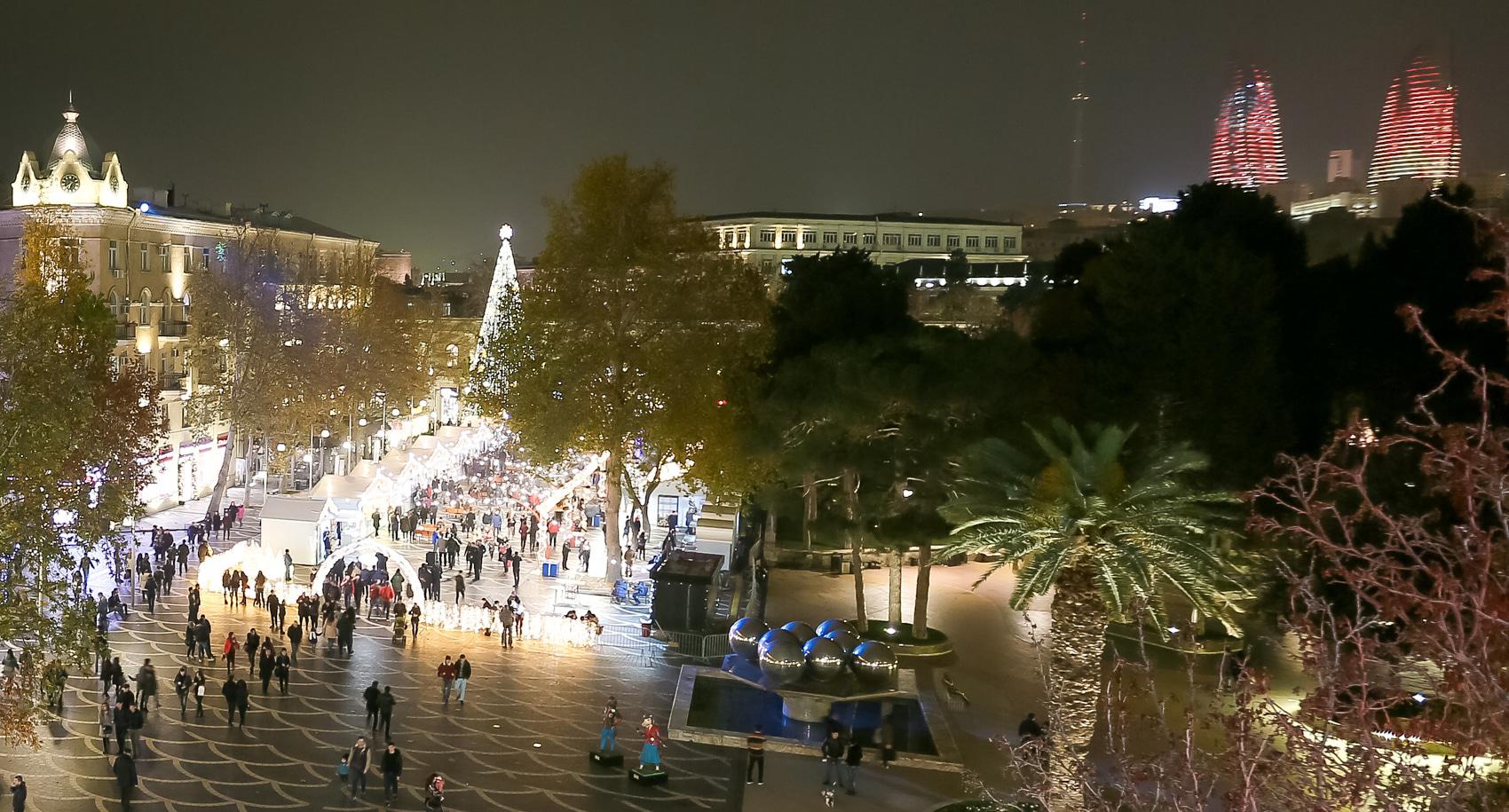 Перед Новым годом Баку особенно красив. В вечерние часы город сверкает иллюминацией. Световыми гирляндами украшены стены Старого города. На Площади фонтанов – новогодняя ярмарка, где можно купить книги и сувениры. Здесь же горожане и туристы могут перекусить в импровизированных кафе. Высокие праздничные елки установлены на Площади Фонтанов, Площади Азнефть и Зимнем парке. Для забавы детворы установлены аттракционы. Близ Девичьей башни можно пройти по «световому тоннелю». Фоторепортаж корреспондента “Кавказского узла” Азиза Каримова.