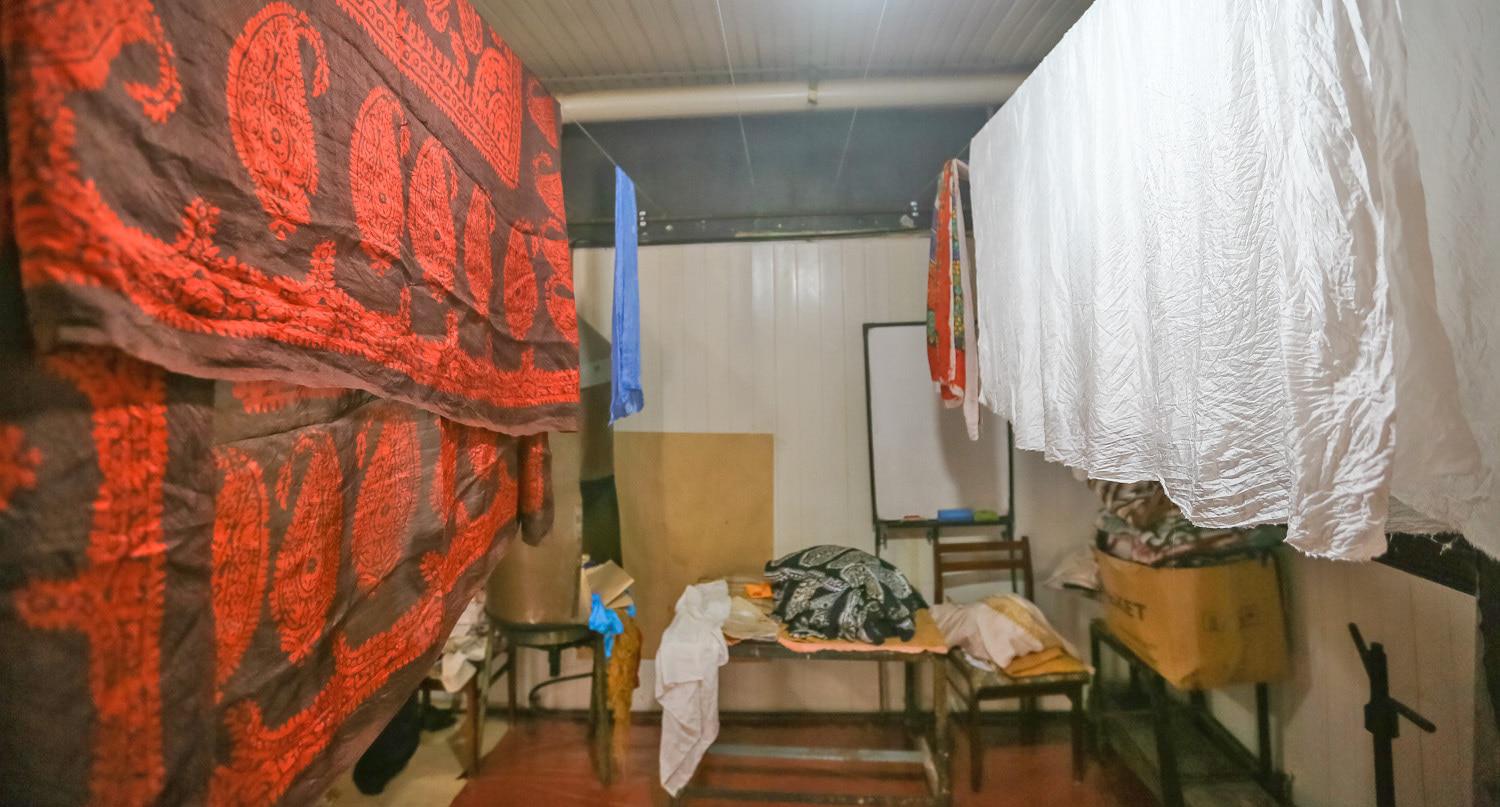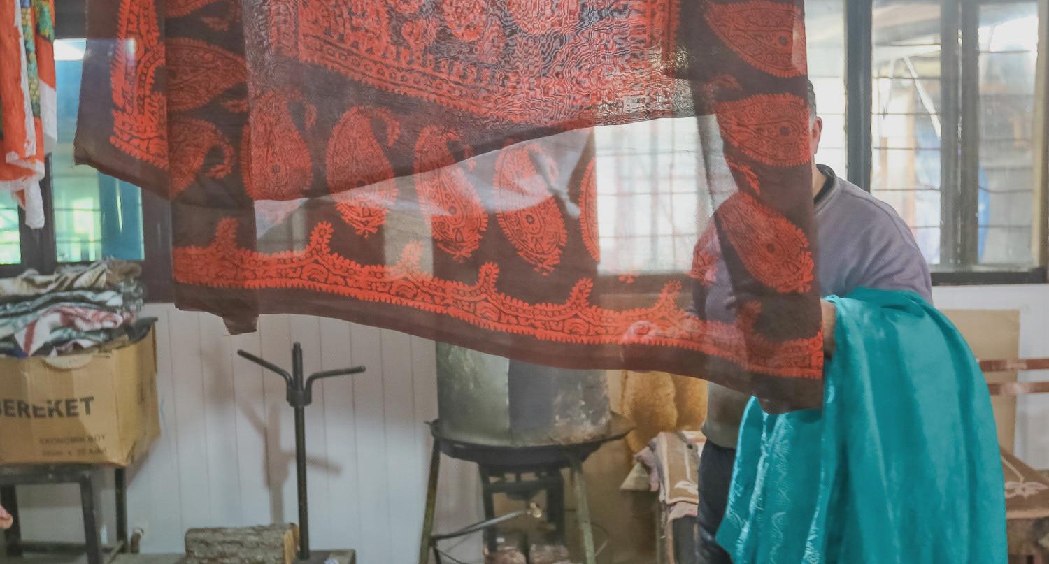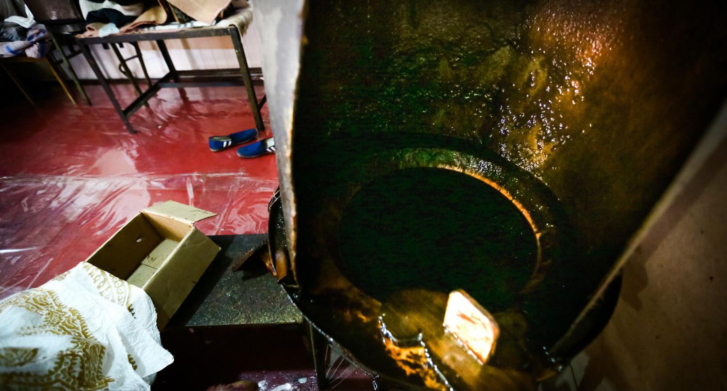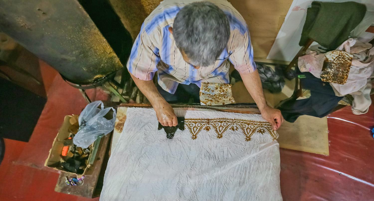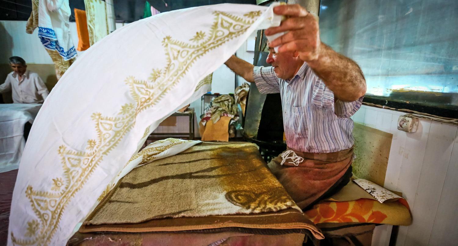 Работающий в цехе Аббасали Талыбов объясняет способы различия натурального шелка от искусственного и говорит, что натуральный шелк после горения превращается в пыль. Если происходит иначе, значит, шелк искусственный.