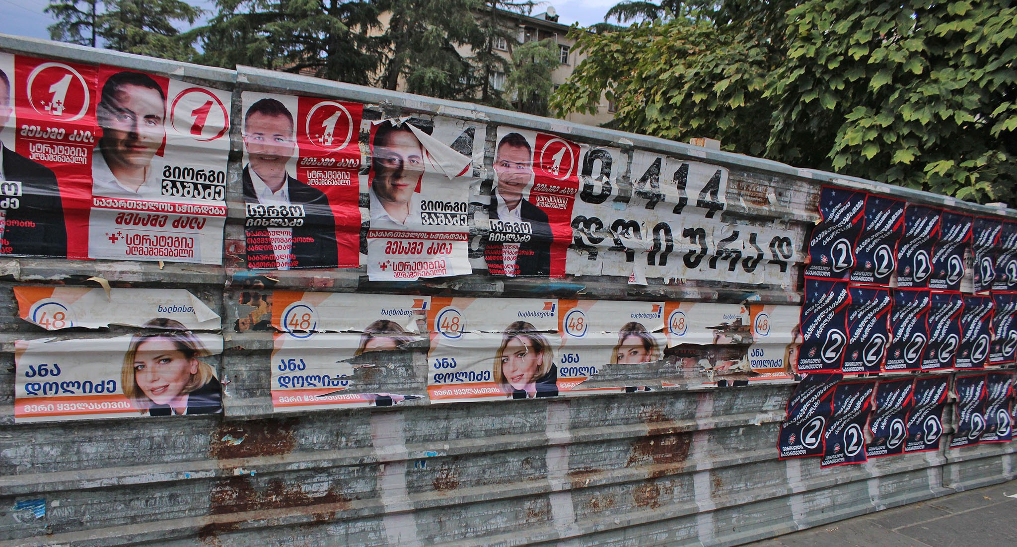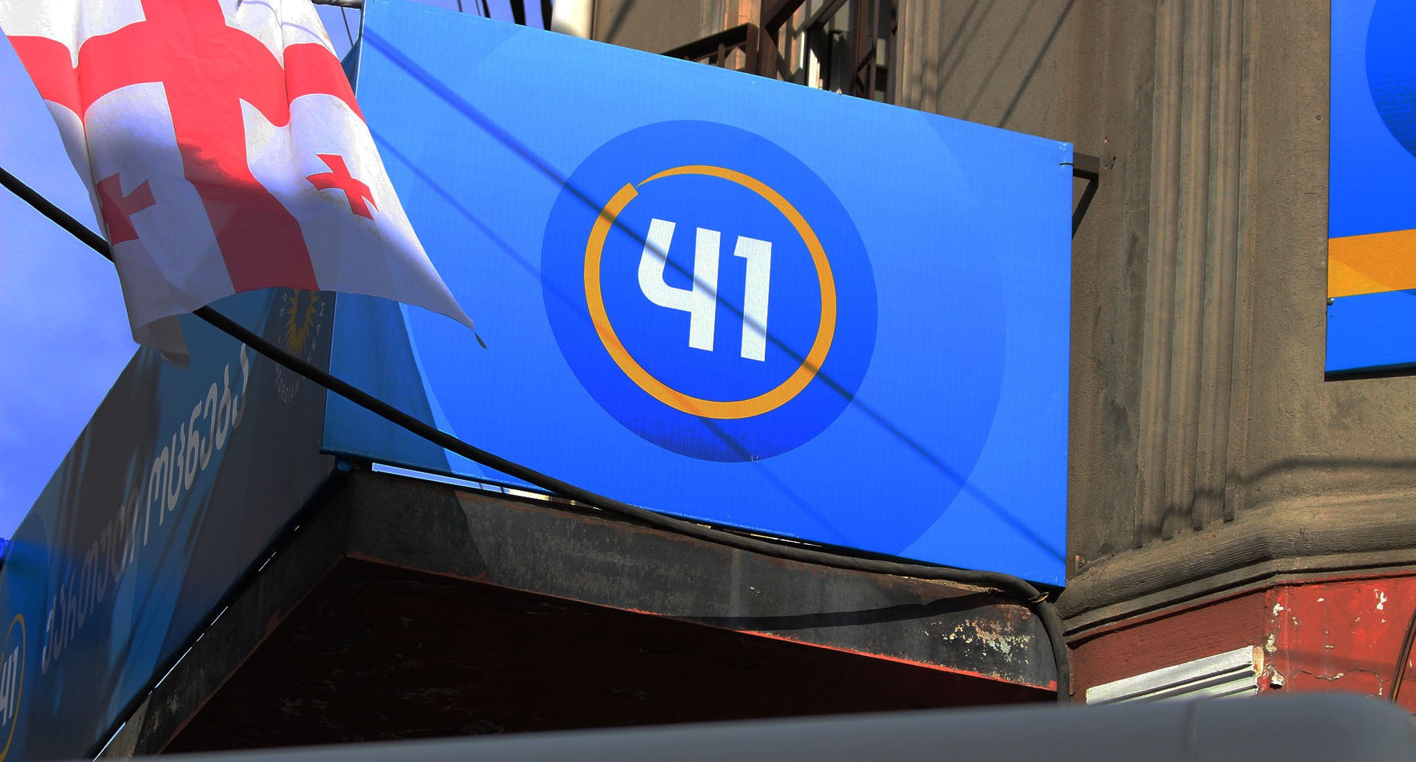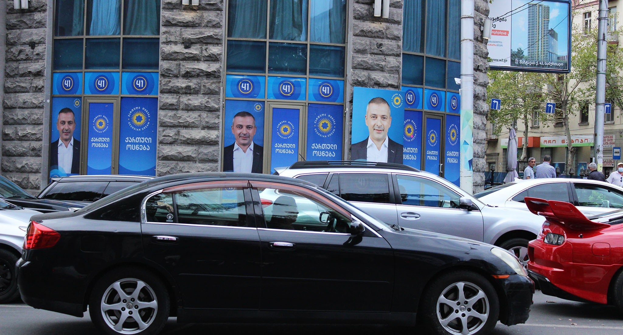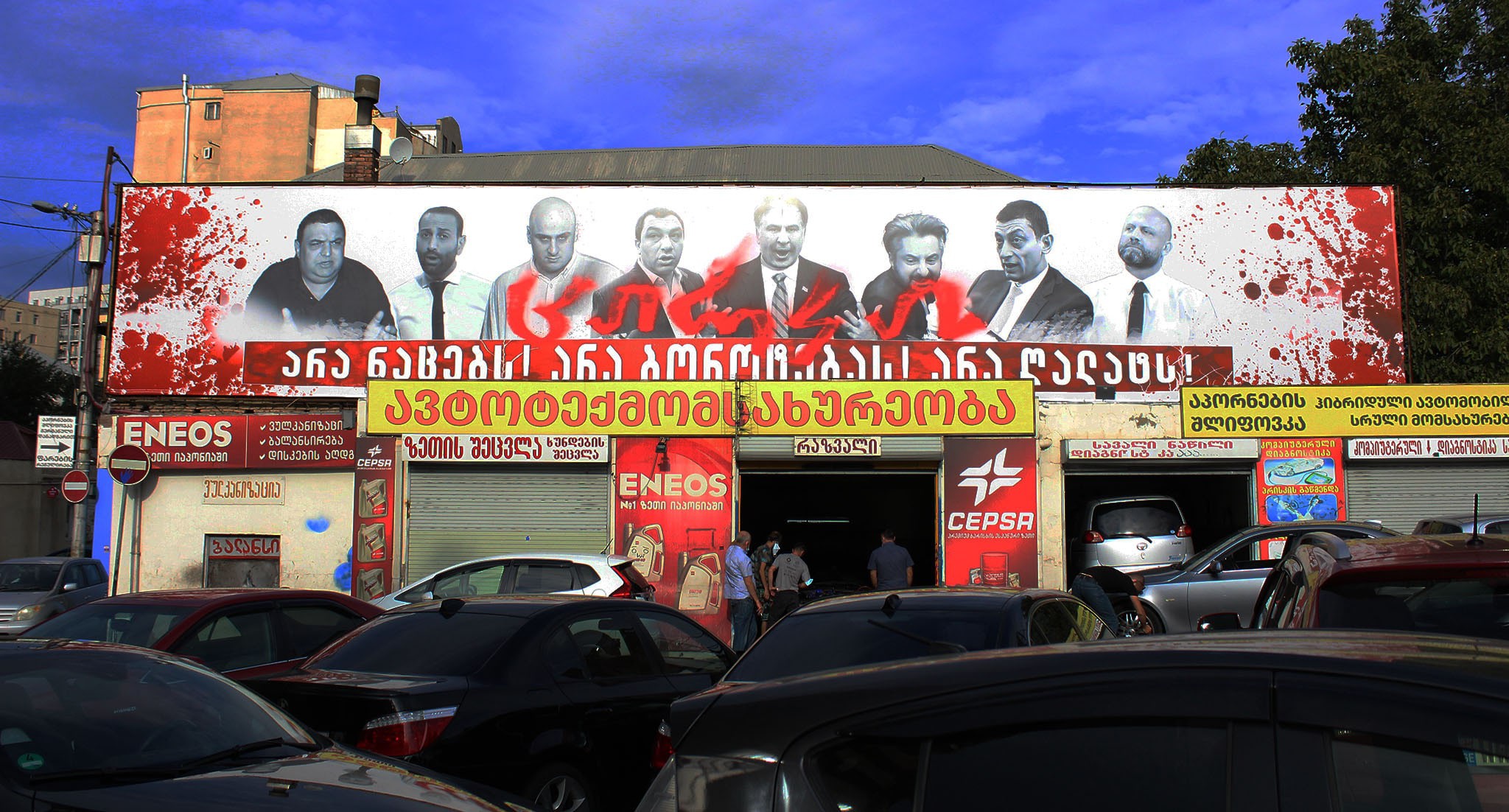 На баннере с "кровавыми пятнами" и фотографиями оппозиционных политиков и журналистов из прооппозиционных СМИ кто-то написал красной краской: "Цирк"