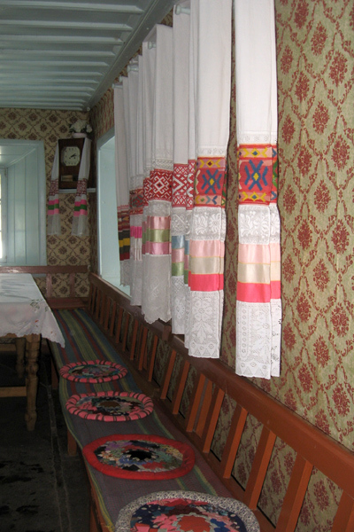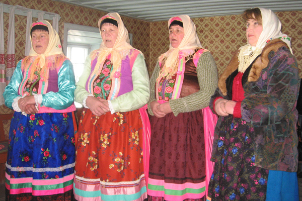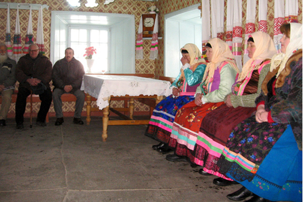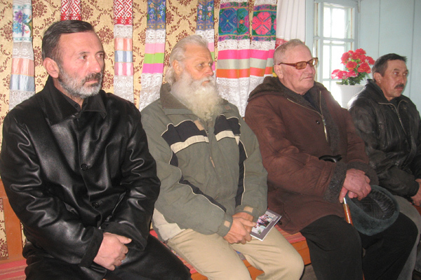 Групповое моление духоборцев в молельне «Сиротский дом». Во время молебна духоборцы сидят на деревянных лавочках, под расшитыми льняными полотенцами – «утирками». Село Гореловка Ниноцминдского района Грузии.