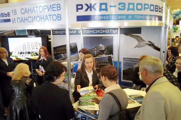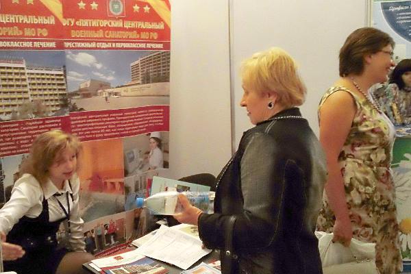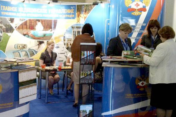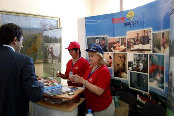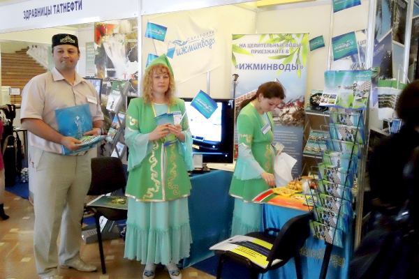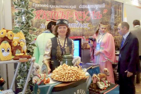 Не только природно-климатические факторы, но и народные костюмы, игрушки-сувениры и национальные лакомства должны были привлечь внимание потенциальных клиентов (стенд санатория Якты-Куль, республика Башкортостан)