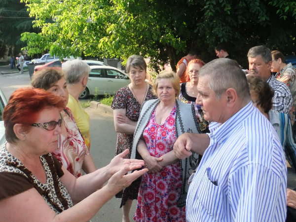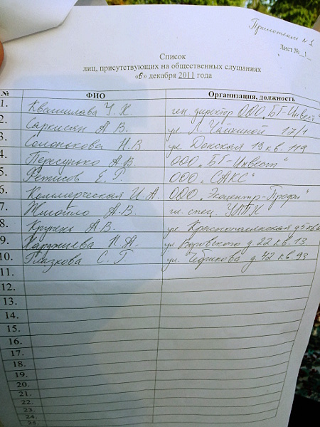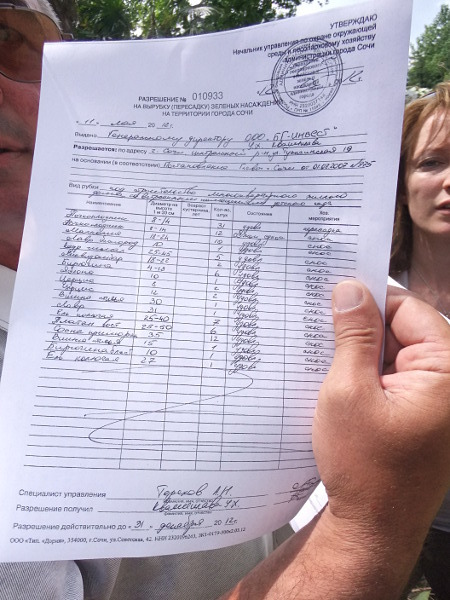 Председатель ТОСа "Завокзальный" Игорь Платонов (второй справа) показывает собравшимся разрешение на рубку здоровых 167 деревьев в парковой зоне и говорит о том, что данный документ нельзя считать законным.